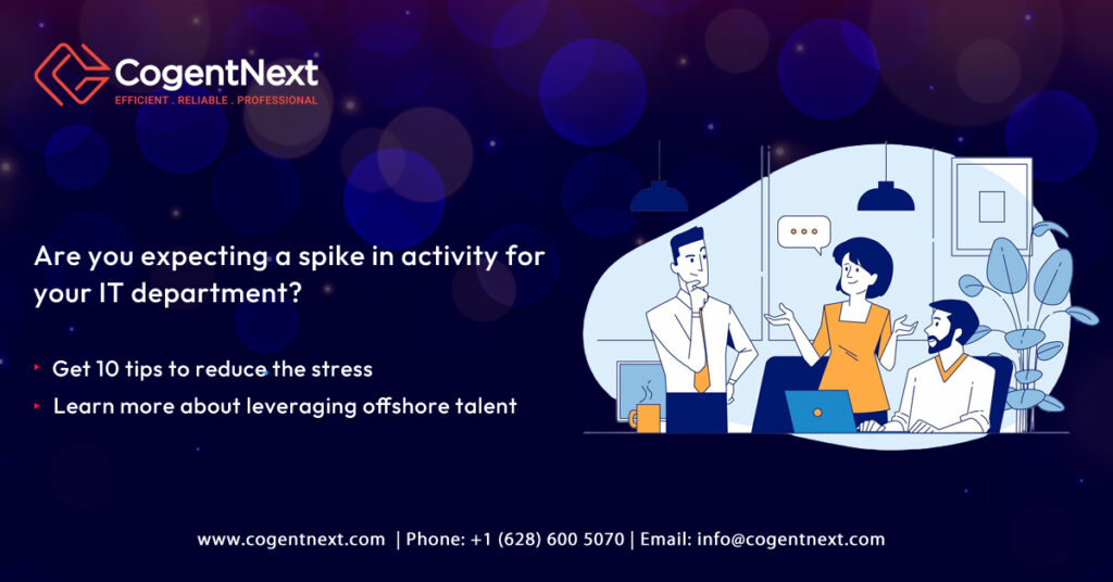 Temporary surges in IT workload can be effectively managed by leveraging offshore talent. External teams can provide the necessary expertise and flexibility to scale operations without overburdening your in-house staff. At CogentNext Technologies, we specialize in supporting businesses with our skilled IT professionals to handle seasonal demands seamlessly.